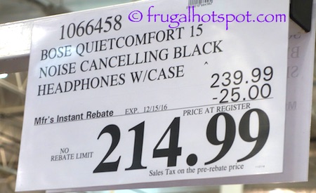 Costco has the Bose QuietComfort15 Acoustic Noise Cancelling Headphones on sale for $214.99 (after manufacturer’s instant rebate), now through December 15, 2016. That is $25 off Costco’s regular price of $239.99. While supplies last.