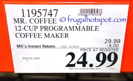 Showering technology ensures water disperses evenly over the grounds to extract the fullest flavors. Select Costco locations have the Mr. Coffee 12-Cup Coffee Maker on sale for $23.99 (after instant savings), now through May 27, 2018. That is $6 off Costco’s regular price of $29.99. While supplies last. Price and participation may vary by location.