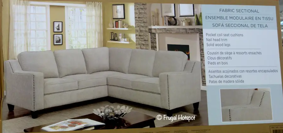 This soft and cozy gray sectional is beautifully finished with brown hardwood legs and bronze nailhead trim. Select Costco locations have the Ellendale Fabric Sectional in stores for a very limited time. It’s priced at $749.99. While supplies last. Item #1325710.
