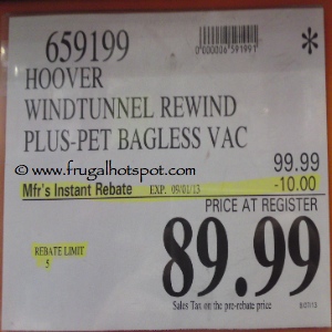 Costco has the Hoover Windtunnel Rewind Plus Pet Bagless Vacuum UH70240 on sale for $89.99 (after manufacturer’s instant rebate), now through September 1, 2013.