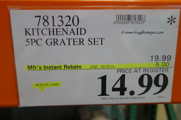*UPDATE* 4/13/14. Costco has the KitchenAid 5 Piece Box Grater & Cup Grater Set on sale for $14.99 (after manufacturer’s instant rebate), now through May 25, 2014. That is $5 off Costco’s regular price of $19.99. The color choices that I saw were red or black. Color selection may vary at your local Costco. Item #781320. While supplies last.