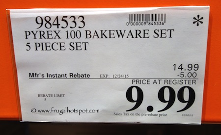 Costco has the Limited Edition Pyrex 5-Piece Glass Bakeware Set on sale for $9.99 (after manufacturer’s instant rebate), now through December 24, 2015. That is $5 off Costco’s new lower price of $14.99. While supplies last.