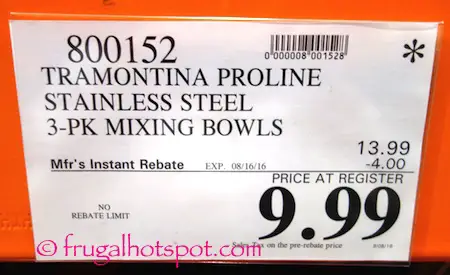 These bowls are just like the ones I used to use in the restaurant. Costco has the Tramontina Proline Stainless Steel 3-Pack Mixing Bowls on sale for $9.99 (after manufacturer’s instant rebate), now through August 16, 2016. That is $4 off Costco’s regular price of $13.99. While supplies last.