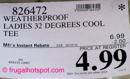 Great for workouts or just lounging at home. Costco has the Weatherproof 32 Degrees Cool Women’s Short Sleeve Scoop Neck T-Shirt on sale for $4.99 (after manufacturer’s instant rebate), now through June 29, 2016. That is $2 off Costco’s regular price of $6.99. While supplies last.