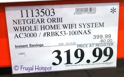 This system delivers up to 6,000 square feet of high performance WiFi. Orbi uses Tri-band WiFi to keep the internet running at max speeds no matter how many devices are connected. Select Costco locations have the Netgear Orbi AC3000 WiFi System on sale for $319.99 (after instant savings), now through February 17, 2019. That is $80 off Costco’s new lower regular price of $399.99. While supplies last.