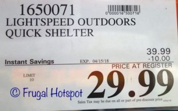 The Lightspeed’s signature side-pull hub opens instantly with no poles to thread for a quick and easy set-up and take-down. Costco has the Lightspeed Outdoors Quick Shelter on sale for $29.99 (after instant savings), now through April 15, 2018. That is $10 off Costco’s regular price of $39.99. While supplies last. Price and participation may vary by location.