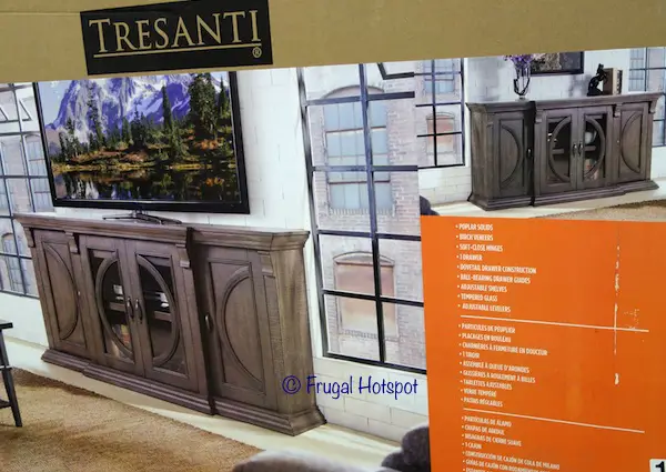 This stunning accent console is made with Poplar solids with Coronado Birch veneers and antique black hardware. It can accommodate most flat screen TVs up to 80″ and 155 lbs. Select Costco locations have the Tresanti Darius 74″ TV Console in stores for a very limited time. It’s on sale for $399.99 (after instant savings), now through February 12, 2019. That is $100 off Costco’s regular price of $499.99. While supplies last. Item #1900056.